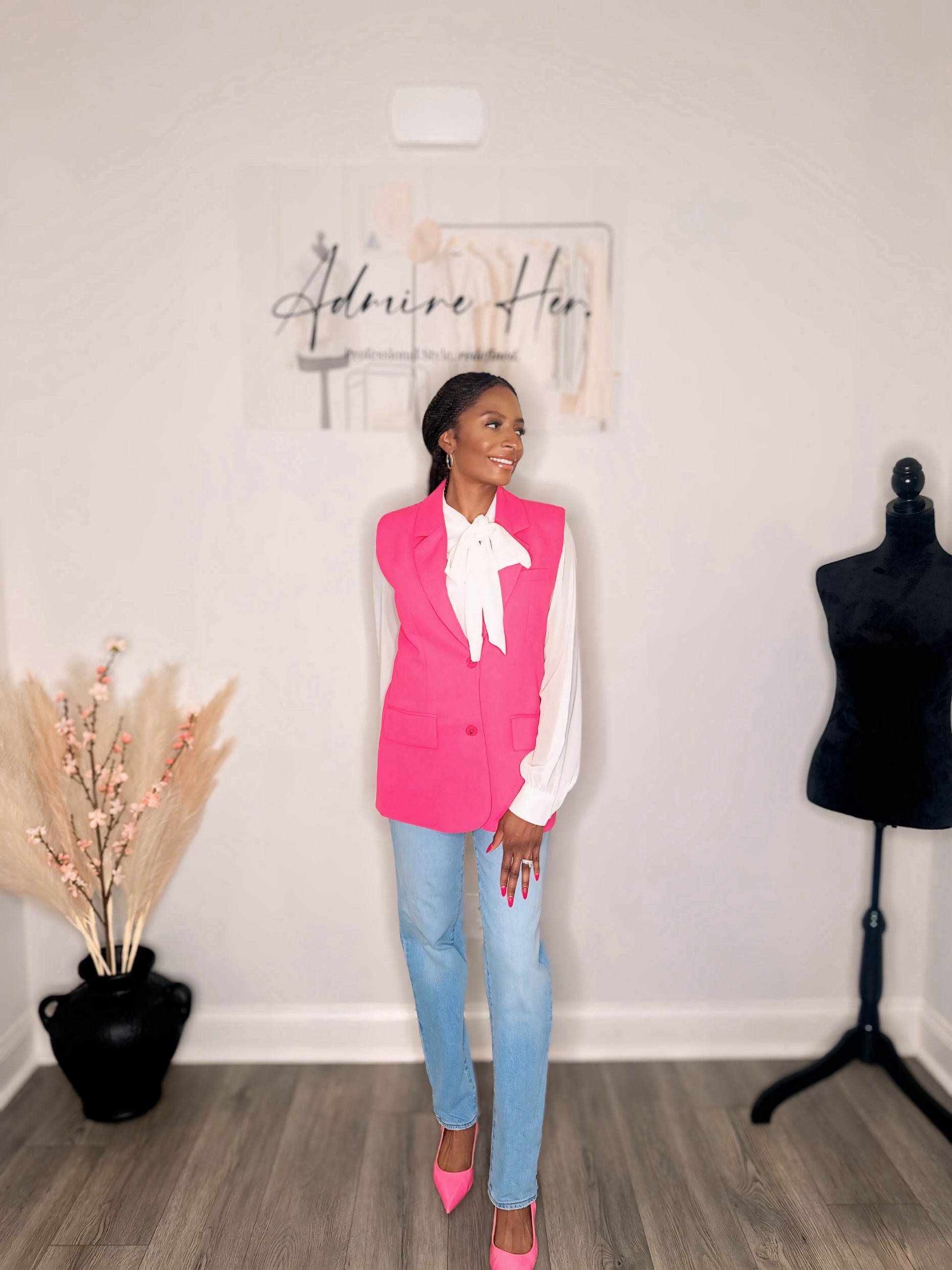 Transform your wardrobe with our oversized fuchsia Vest b[lazer! This statement piece features a double button closure and light shoulder pads for a chic and modern look. Elevate any outfit with this bold and stylish addition. Perfect for making a statement and standing out from the crowd.